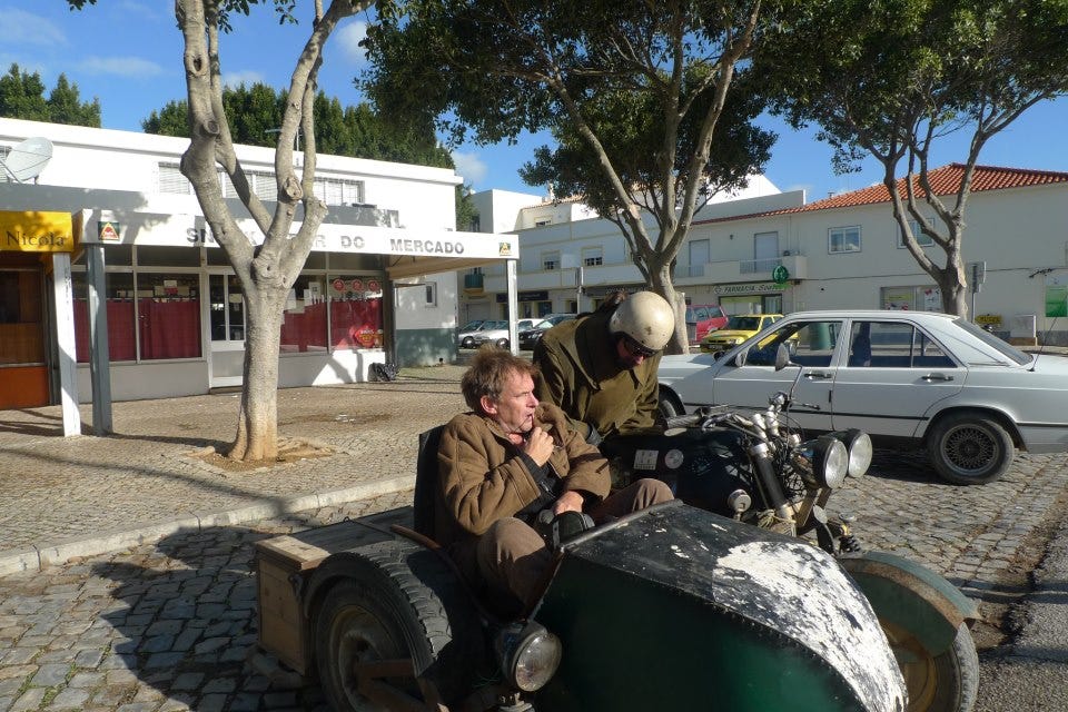 Ik kan vervoer regelen: deze oude motor met zijspan. Ik kan niet rijden, dus dat mag jij doen. De ideale Bob!
