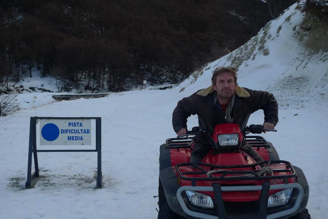 Ik op de brommer op de piste van Cerro Castor, Ushuaia, Vuurland.